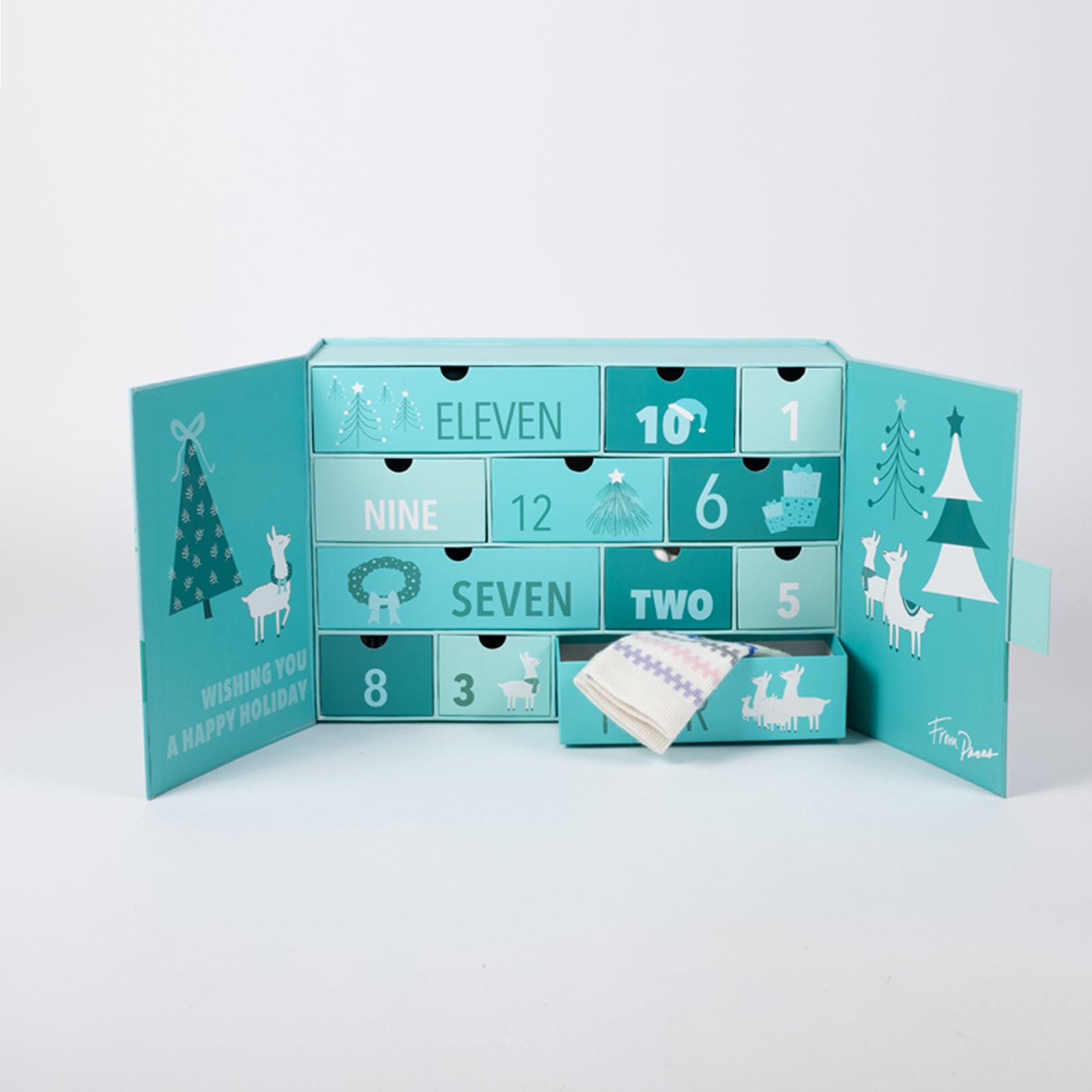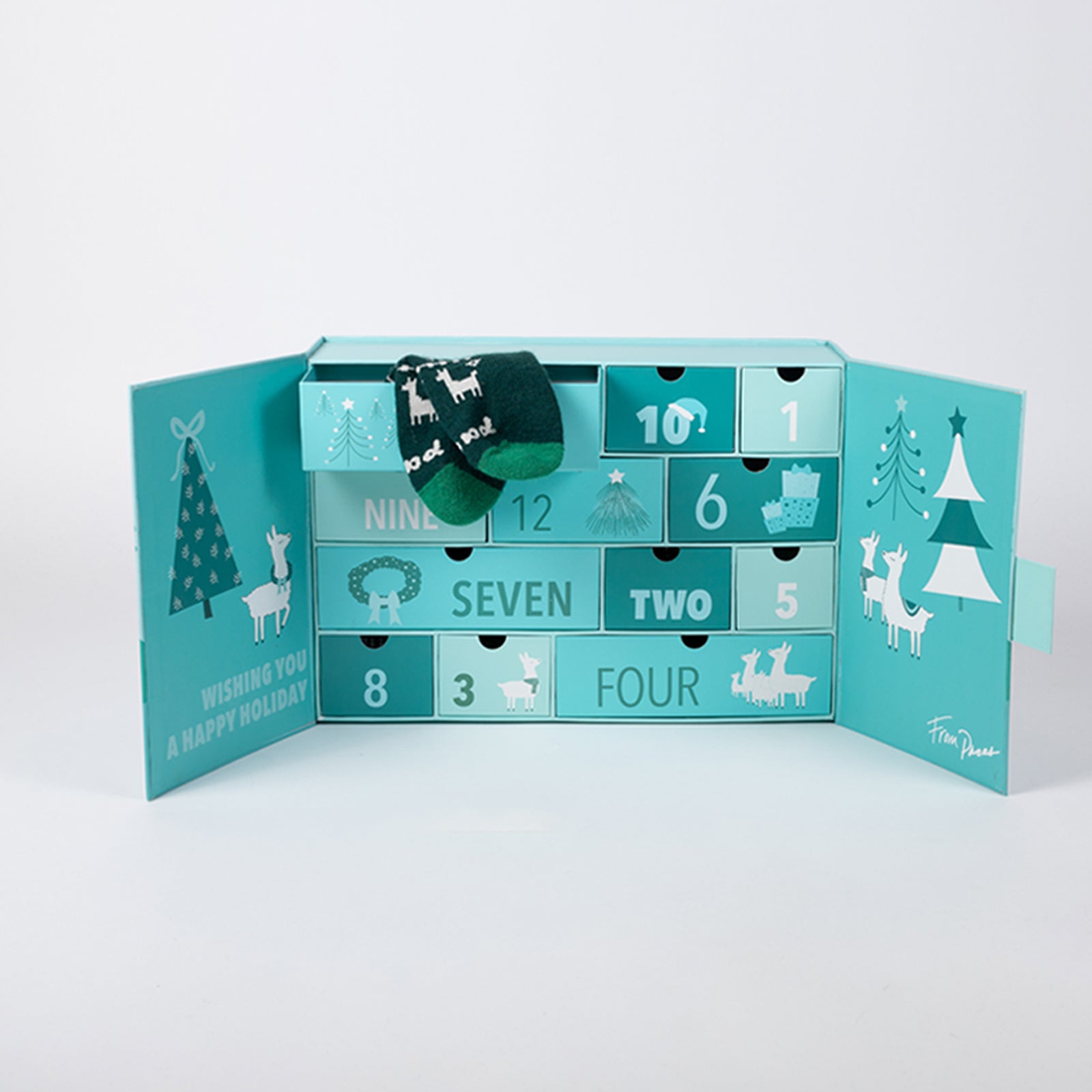 Count down to the holidays with this festive, limited edition advent calendar! Each drawer features a unique pair of our best-selling socks. Dimensions: 15"x10.5"x4.25"